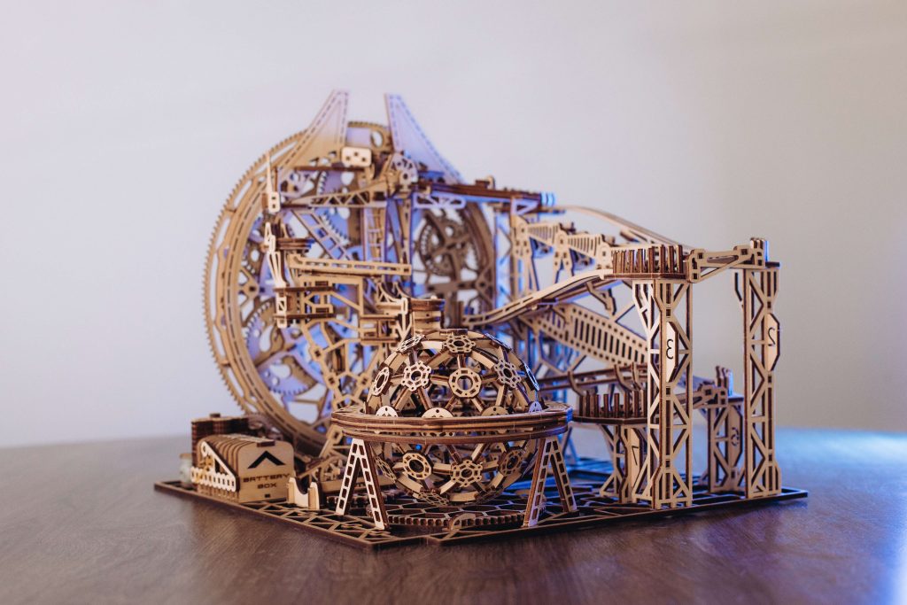 Ce kit de construction signé Wooden City et Ugears est une merveille de montage mécanique : engrenages, billes, rails, tout s’imbrique dans une chorégraphie hypnotique.