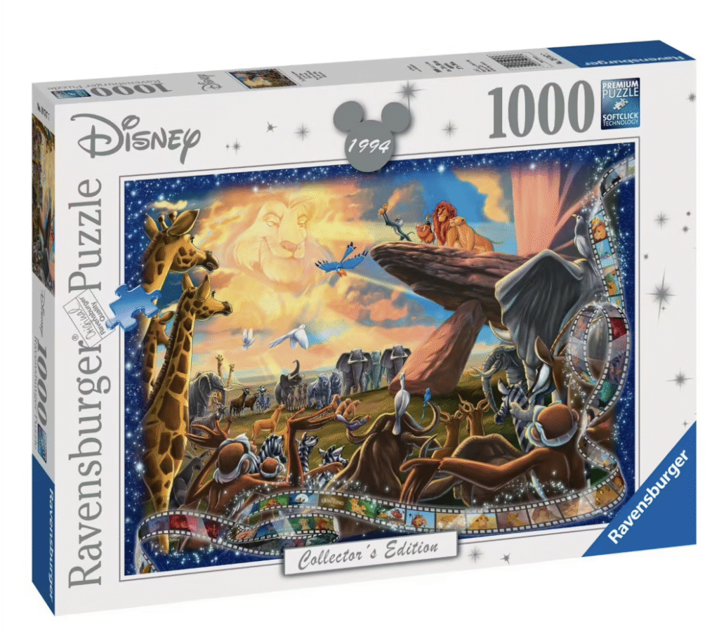 Pour les amateurs de scènes majestueuses, les puzzles du Roi Lion occupent une place centrale. Ce puzzle 1000 pièces illustre une scène mythique du film, imprégnée de couleurs chaudes et vibrantes. Il s’adresse aux adultes qui veulent un jeu technique mais non décourageant : un challenge équilibré, parfait pour progresser en rythme.