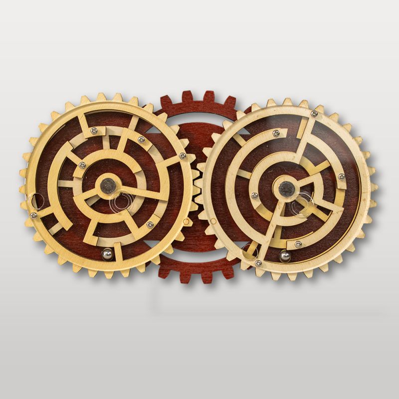 Labyrinthe double-plan relié par engrenages ; sortir 2 billes en synchronisant les mouvements.