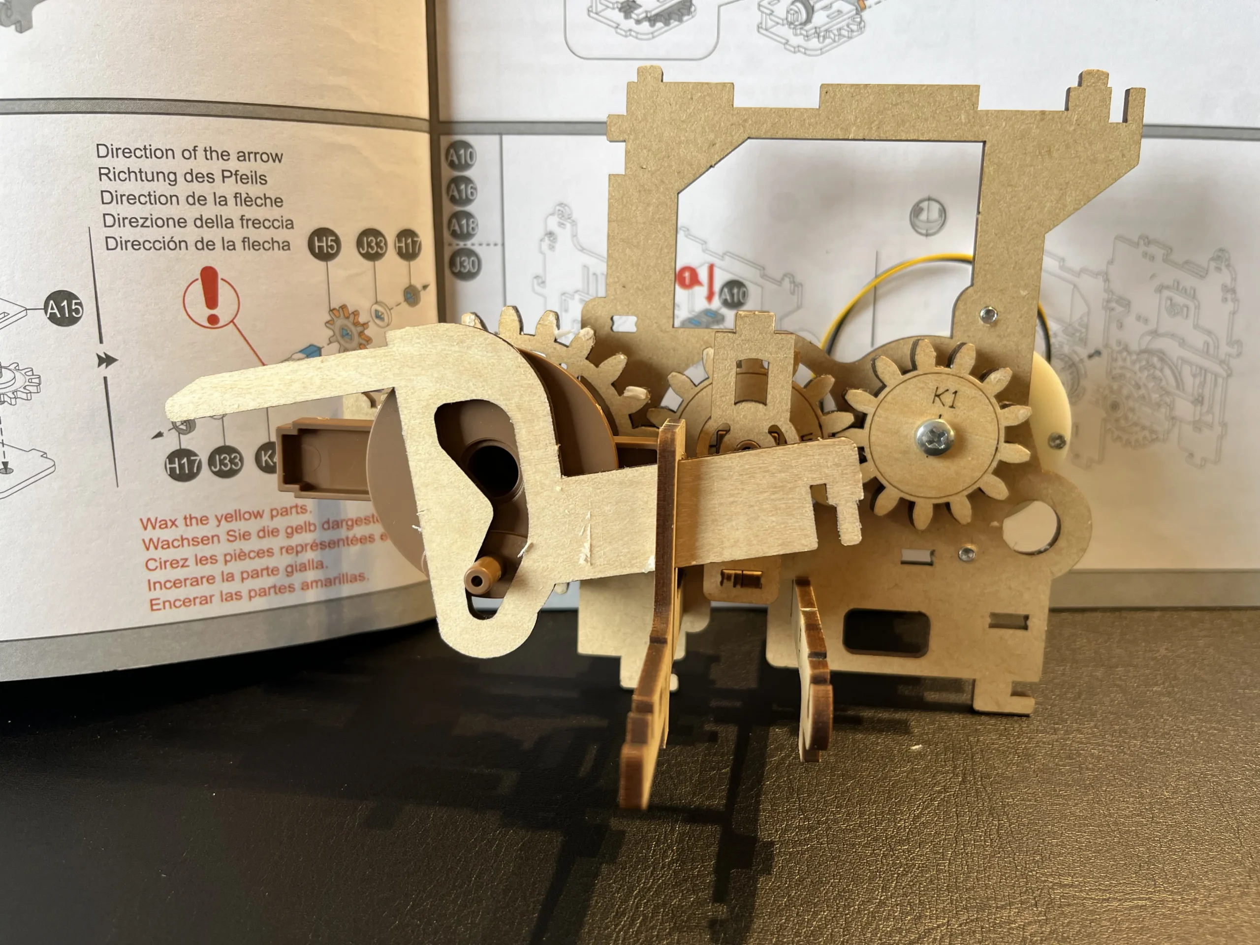Tout n’est pas ludique, et c’est aussi important de le dire. Le cirage des éléments demande de la patience. Un petit rectangle de cire est fourni pour lubrifier certaines pièces, mais le geste est minutieux, parfois un peu salissant. La cire se retrouve facilement sur la table, voire sur les doigts, et un nettoyage s’impose après coup.